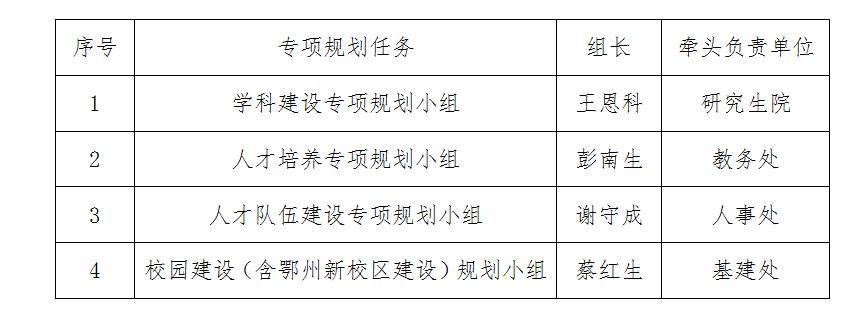 (四)成立4个365bet足球数据直播“十三五”专项规划编制工作小组,分别为学科建设专项规划小组、人才培养专项规划小组、人才队伍建设专项规划小组和校园建设(含鄂州新校区建设)规划小组,具体负责各专项规划编制工作。各工作小组明确一个牵头单位,具体负责规划的起草以及与学校“十三五”规划编制工作领导小组办公室的联系和协调工作。