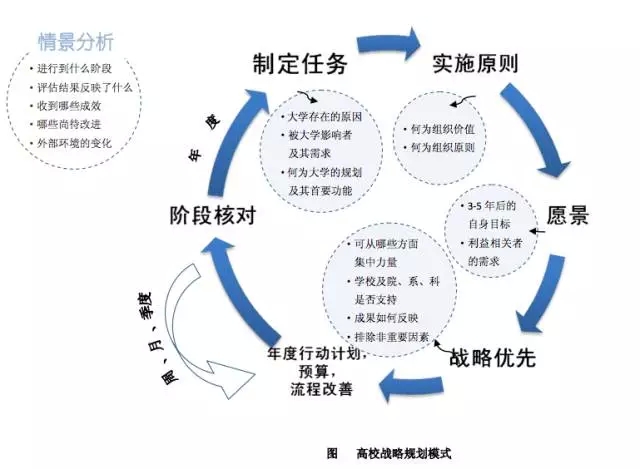 美国威斯康星大学麦迪逊分校的Kathleen A.Paris将高校战略规划模式归纳如下:从制定任务开始,经过实施原则的确认、愿景的描述、优先战略的修改到年度行动计划、预算、流程改善等步骤的严格考量,分别经过周、月、季度以及年度的阶段核对,最终确定发展规划战略。其中情景分析步骤是可以贯穿于整个规划过程始终,对制定行为起到一个监测作用。